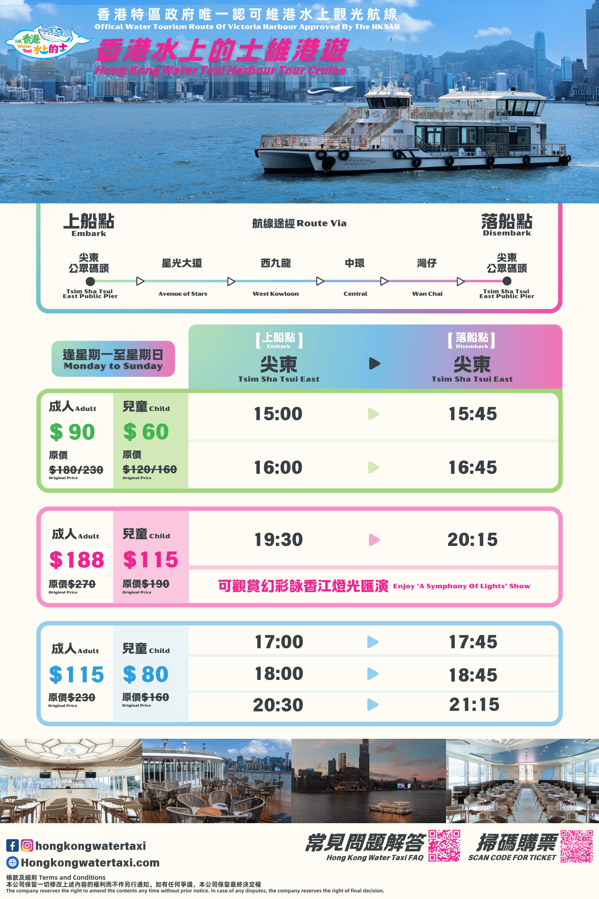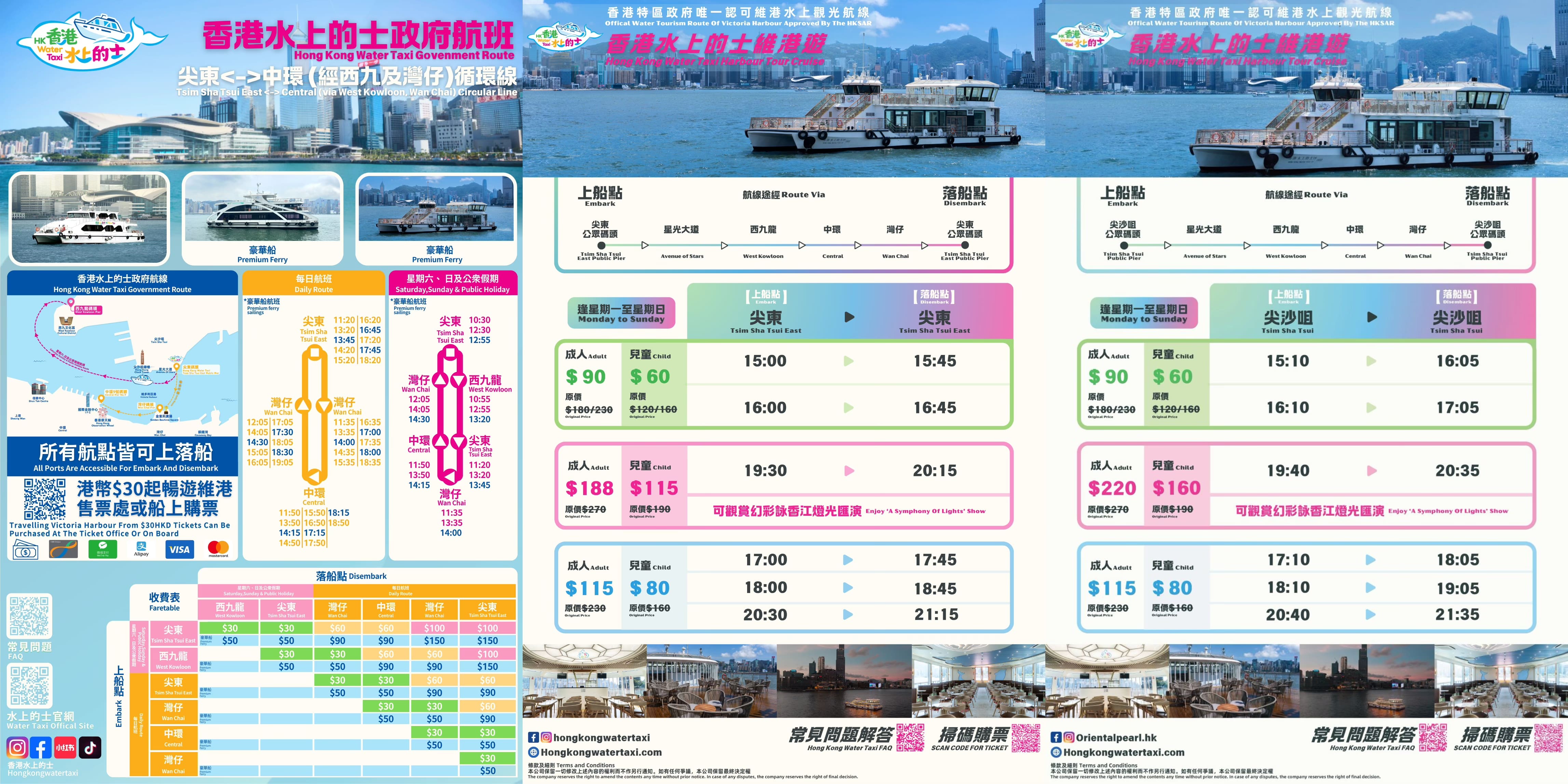 购买渠道: 香港水上的士官网或红磡码头、尖东码头及中环码头售票处