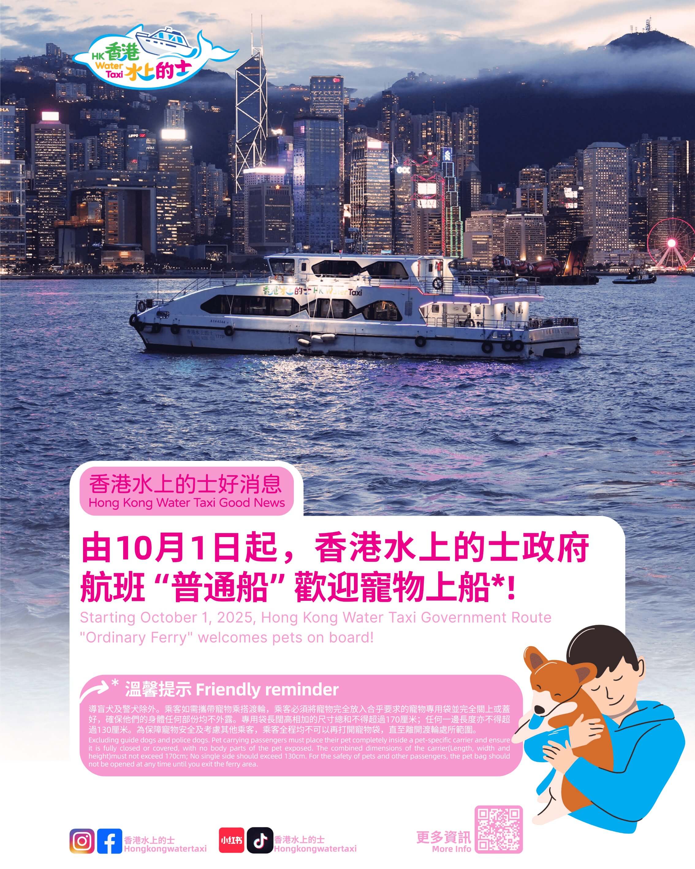 Starting October 1 2025, Hong Kong Water Taxi Government Route "Ordinary Ferry" welcomes pets on board!